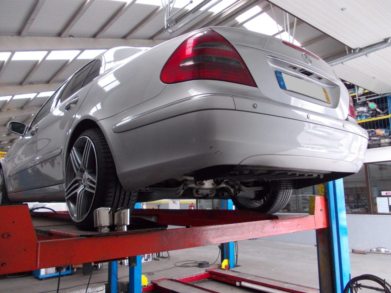 Montaje de 2 silenciadores traseros + 2 boquillas de escape de acero inoxidable en un Mercedes E220